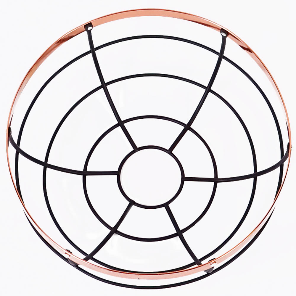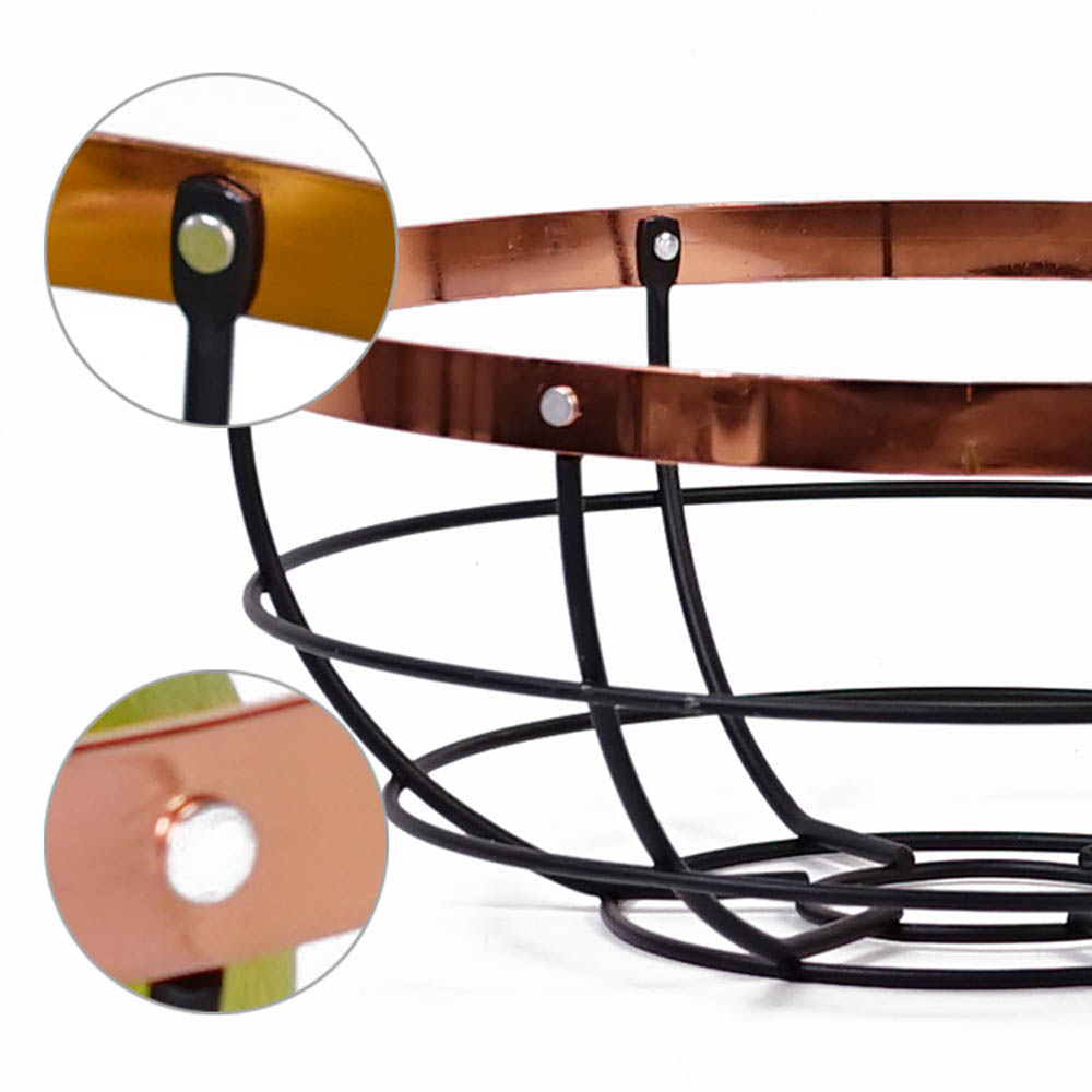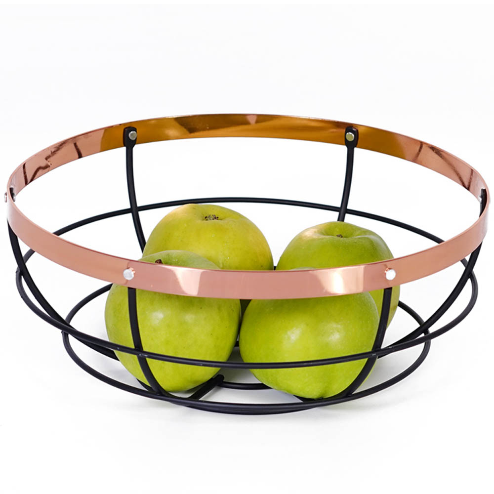 Επιτραπέζια στρογγυλή φρουτιέρα μεταλλική σε μαύρο ματ χρώμα και διακόσμηση σε ροζ χρυσό. Έχει διάμετρο 26 εκατοστά, 10,5 εκατοστά ύψος και έχει μοντέρνο και εντυπωσιακό σχεδιασμό.